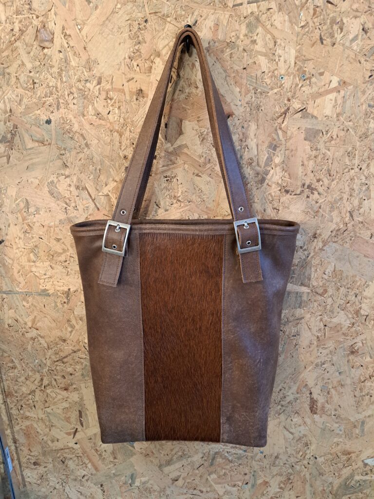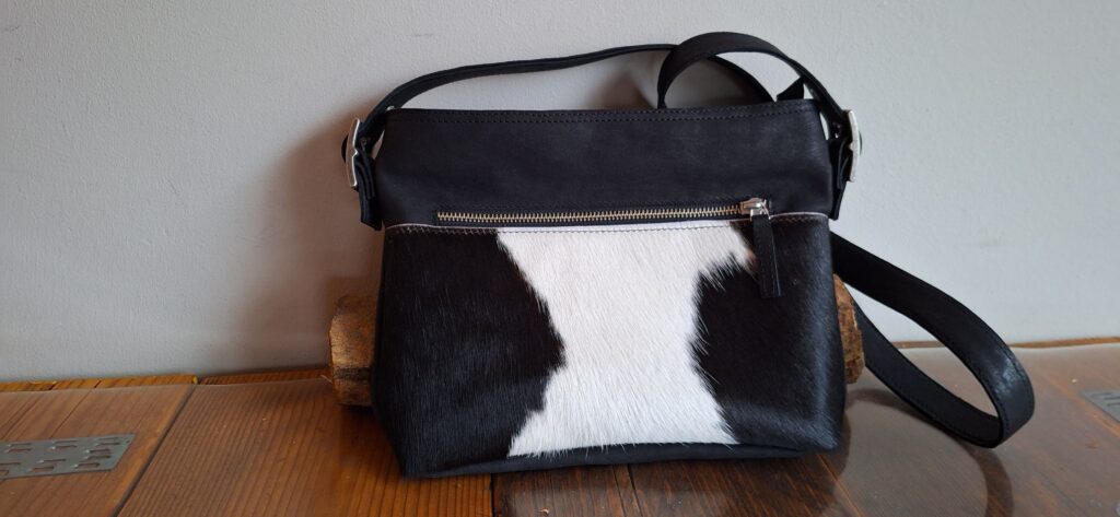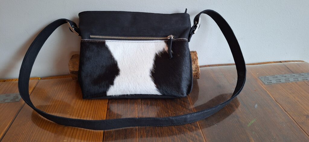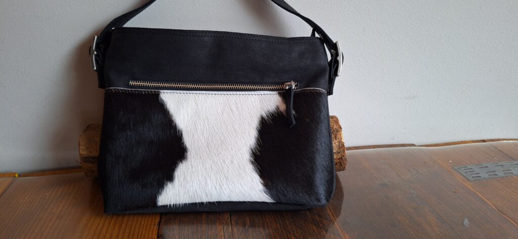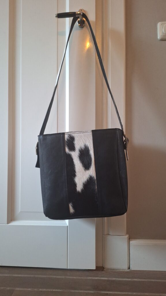 Grote schoudertas met extra versteviging om te gebruiken als boekentas. Met binnen voering en verstelbare schouderriem. Een voorkant van links en recht glad leer en een strook vachtleer in het midden. Achterkant bestaat ook uit drie delen, deze zijn allemaal van glad leer. De versteviging zorgt voor een fijne pasvorm voor de boeken.