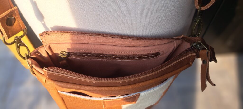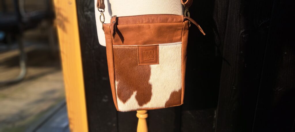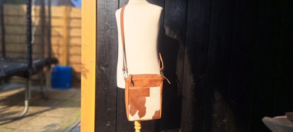 Deze tas mocht ik maken naar de specifieke wensen van de klant. Mooie cognac kleur is er gekozen om deze tas te maken. Met een deel vacht en afgewerkt met voering. Naast de extra, met rits afgesloten, binnen zak zit er aan de buitenkant een vak dat is afgesloten met een magneetsluiting.